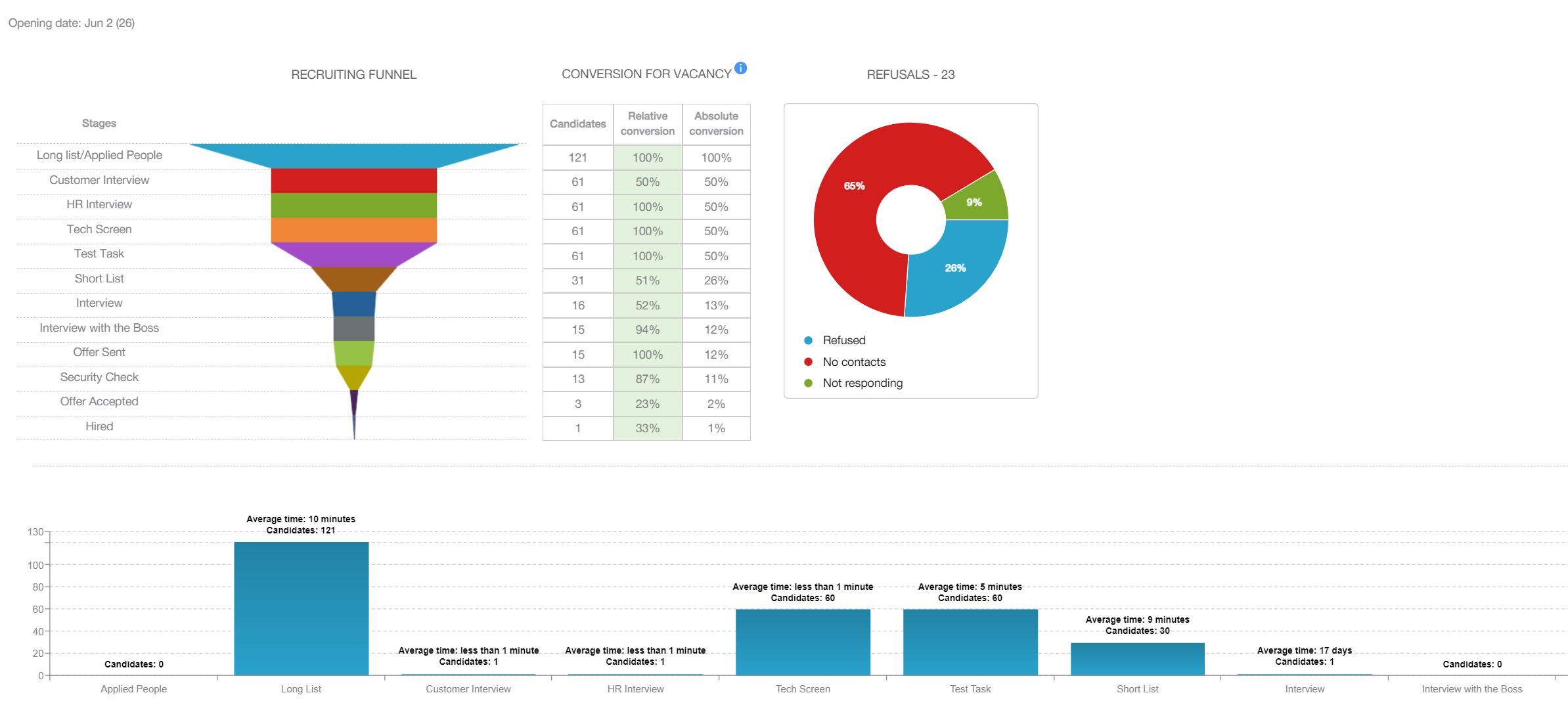 Now, it will be much easier to analyze the conversion and efficiency of stages (funnel) and the actual time spent by candidates on these stages in one report, as well as to set the average time spent by candidates on them (histogram).