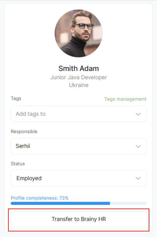 - Automatic transfer — candidates with the status “Our employee” are instantly added to Brainy HR.