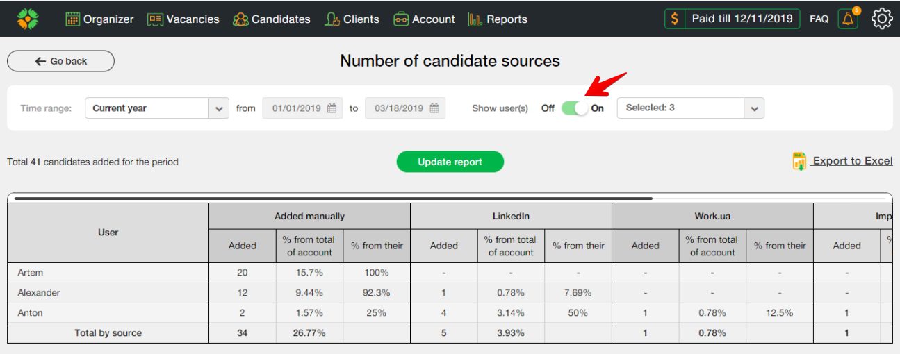 Последний столбец показывает процентное соотношение добавленных кандидатов и количество наймов. Хотим отметить, что отчет базируется на привязке по дате добавления кандидата. Если вы добавили кандидата на прошлой неделе, а на работу он вышел на текущей неделе, то как успешный кандидат он отобразится в отчете именно за прошлую неделю.
