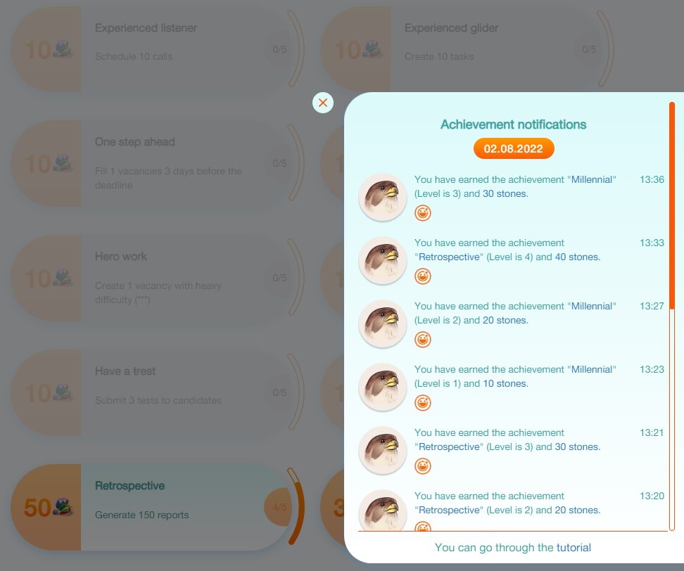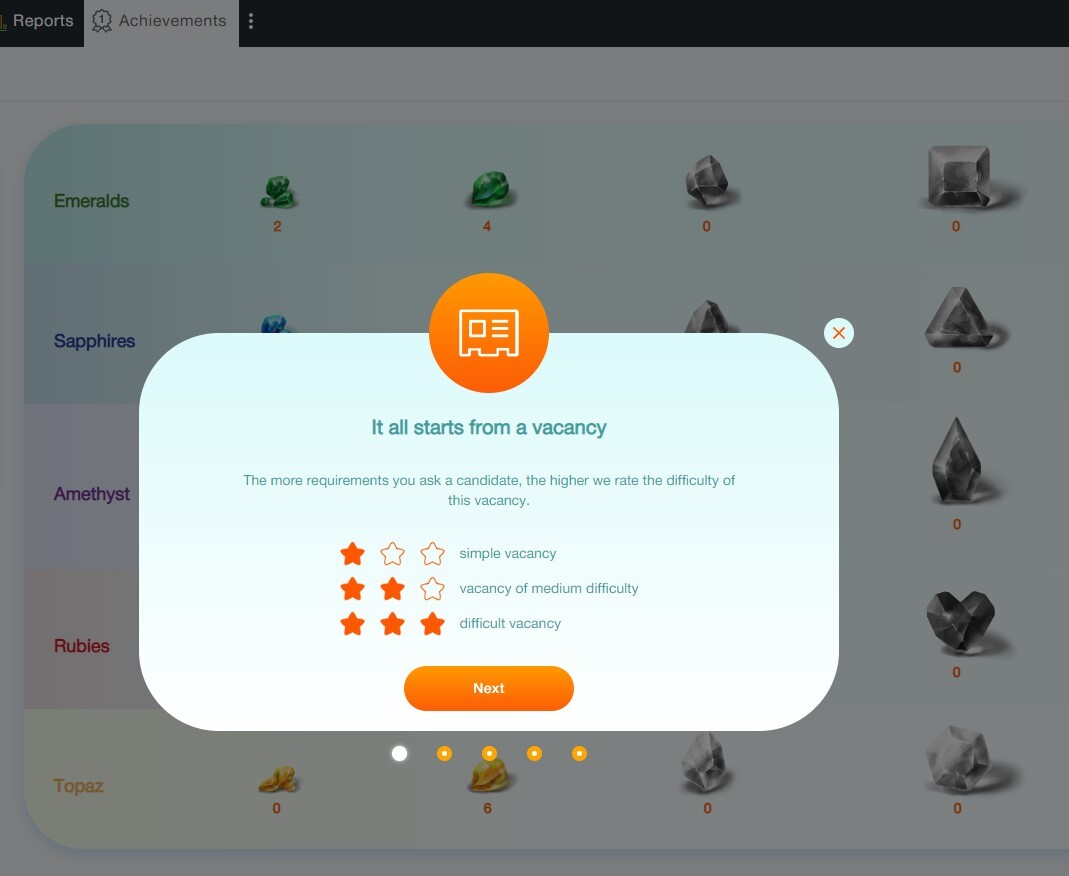 Tutaj pokazują się poziomy, klejnoty, osiągnięcia za miesiąc/kwartał/rok itp. Jeśli rekrutera zainspiruje rywalizacja, zawsze może zaangażować się w ten „sport”, nadrobić zaległości i zająć nagrodzone miejsce.