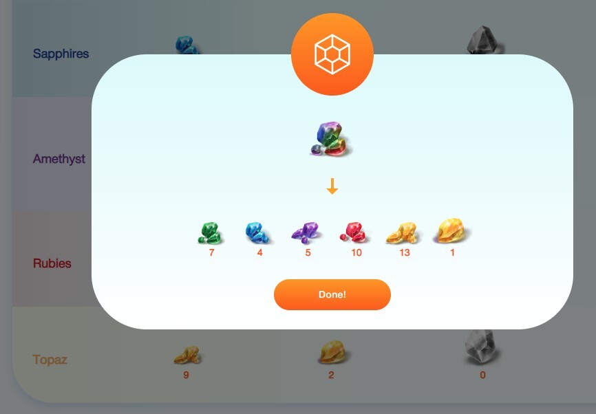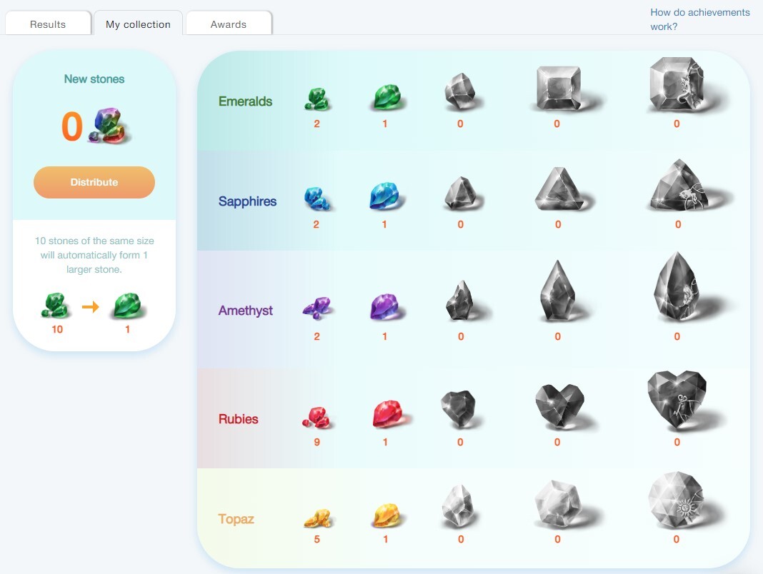 Pomagają nam w tym kamienie różnych poziomów. Bardzo małe wymieniane są w skali 1:10. Na przykład, aby zdobyć kamień poziomu 2, potrzebujesz 10 małych osiągnięć, poziom 5 – potrzebnych będzie już 10 000 małych osiągnięć. Nie robi się tego bardzo szybko, stąd też szczególnie pożądane stają się duże kamienie.