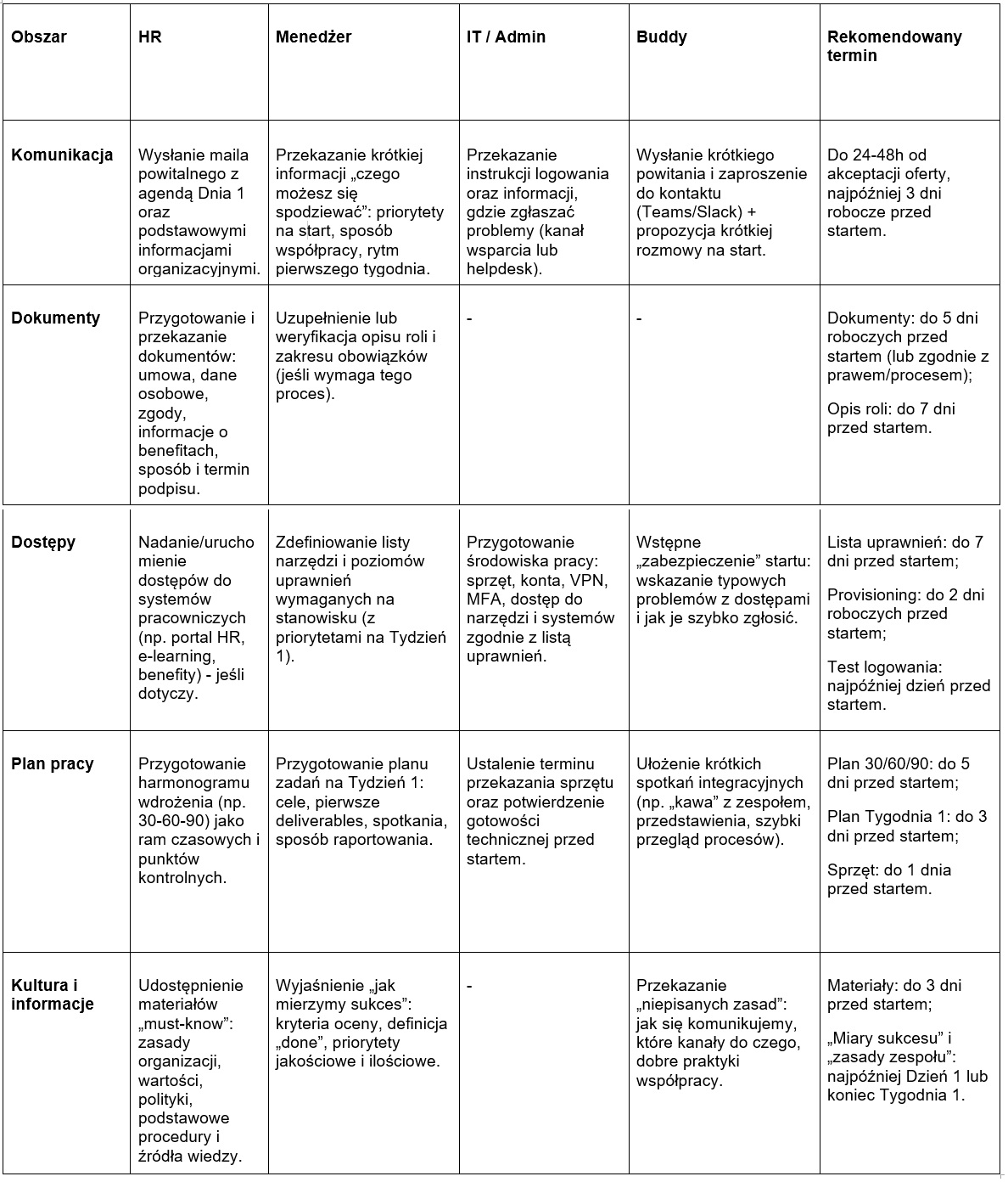 HR odpowiada za przygotowanie i koordynację części formalnej onboardingu: dokumentów, regulaminów, BHP, RODO, informacji o politykach wewnętrznych oraz podstawowych zasadach organizacyjnych. Dba także o spójność procesu (checklisty, terminy, standard komunikacji) oraz monitoruje, czy nowa osoba otrzymała komplet kluczowych informacji „na start”.