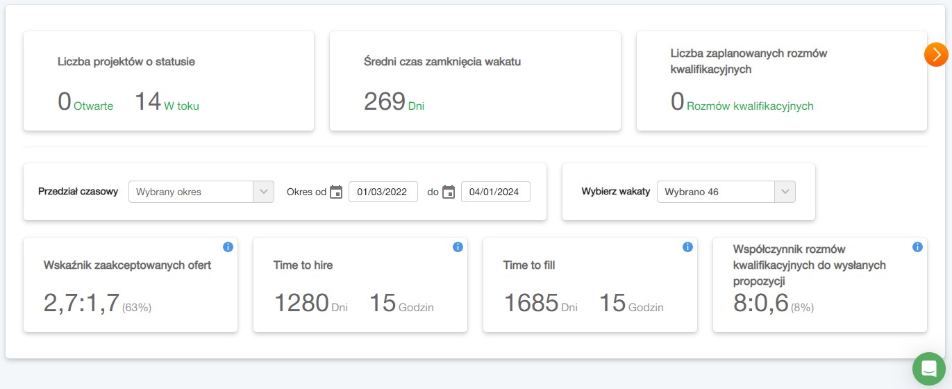 Dashboard pokazuje aktualny stan zadań: bieżącą liczbę ofert pracy w statusach „Otwarta” i „W pracy”, średni czas ich zamknięcia, liczbę zaplanowanych rozmów kwalifikacyjnych we wszystkich kontach użytkowników.