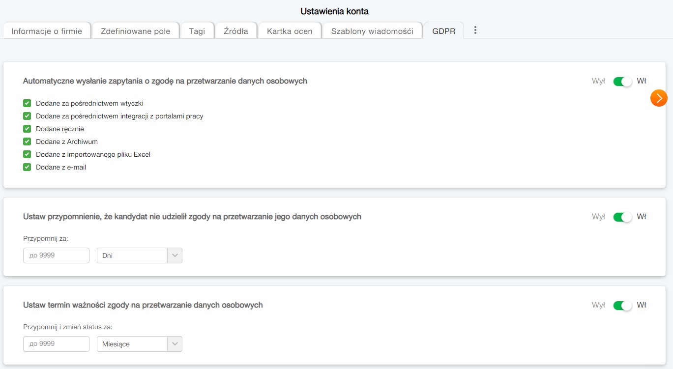 Teraz użytkownik może włączać i wyłączać automatyczne wysyłanie zapytania GDPR przy dodawaniu kandydata do bazy, ustawiać przypomnienia, jeśli odpowiedź na zapytanie nie została udzielona przez kandydata, wyświetlać listę kandydatów, ustawiać przypomnienia o wygaśnięciu zgody itd.