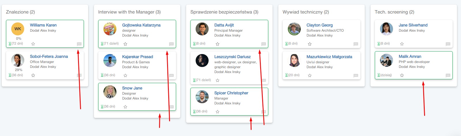 Teraz kandydaci nie są wyświetlani w postaci tabeli, a w formie kartek. Na tych kartkach są widoczne wszystkie ważne informacje dotyczące kandydata: imię i nazwisko, zdjęcie, stanowisko, ocena itp. Kartkę kandydata można przesuwać etapami, trzymając kursor na karcie i „przenosząc” ją na odpowiedni etap.
