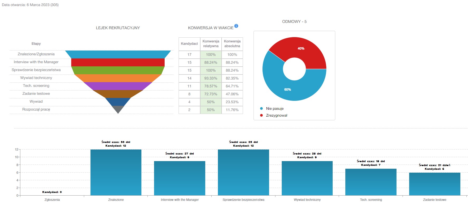 W 2023 roku zaktualizowaliśmy raport z oferty pracy, dodając do niego histogram etapów oraz średni czas przebywania kandydatów na każdym z nich.