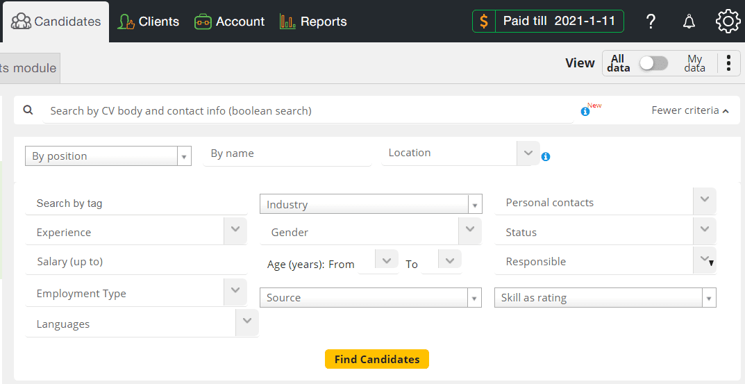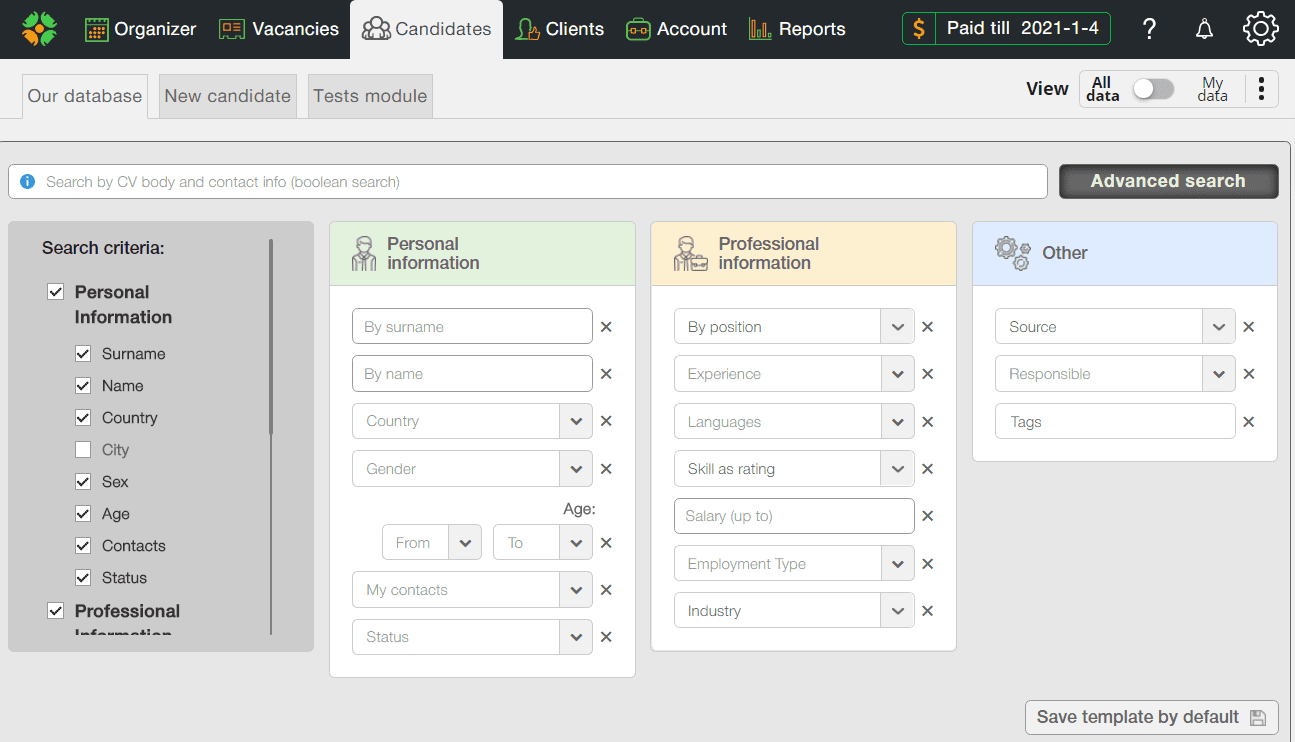 Удобный поиск по базе — залог эффективной автоматизации рутинной работы рекрутера. Мы внедрили в систему несколько улучшений, которые сделали поиск по базе кандидатов еще более user-friendly. Помимо прочего, теперь он умеет запоминать критерии, по которым вы предпочитаете подбирать кандидатов.