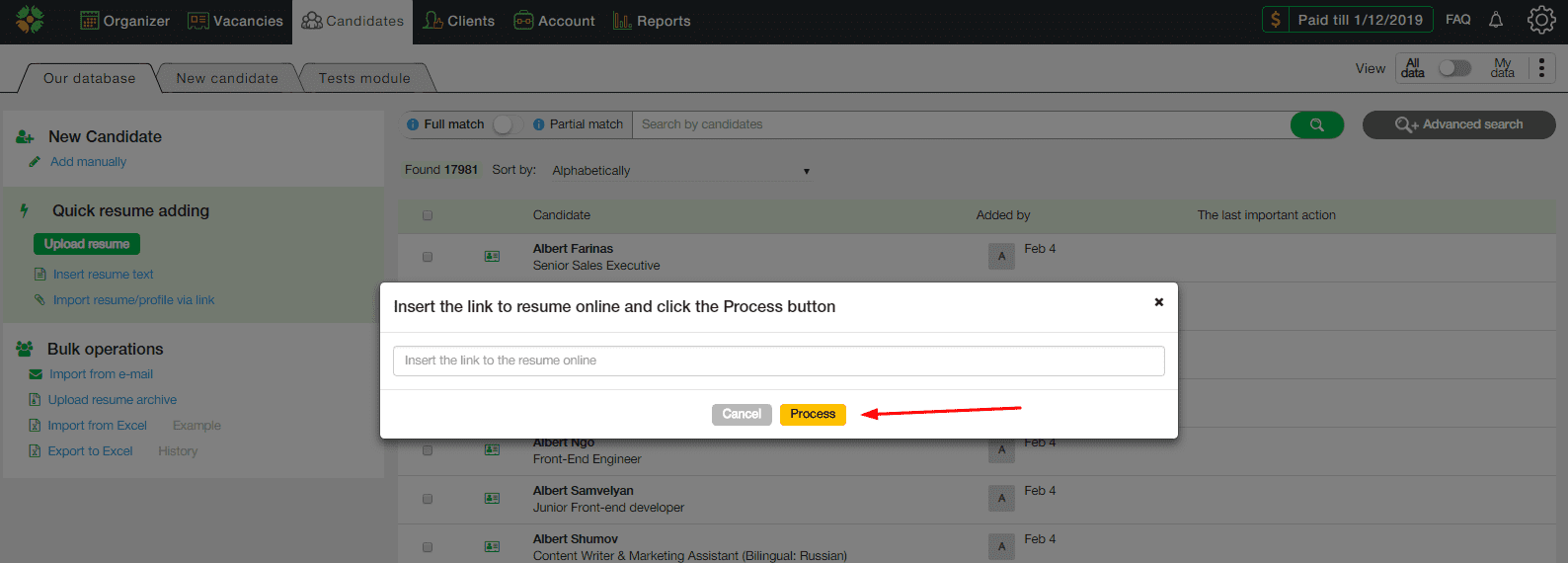 Перед вами появится поле, куда необходимо вставить ссылку, которая ведет на резюме. После этого нажмите на кнопку “Обработать” и через пару секунд резюме преобразится в карточку кандидата и будет выгружено в вашу базу.