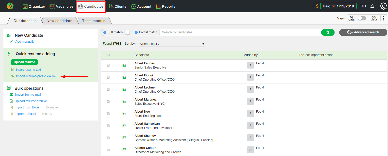 Во вкладке “Кандидаты” нажмите на кнопку “Перенести резюме по ссылке”, как показано на скриншоте.