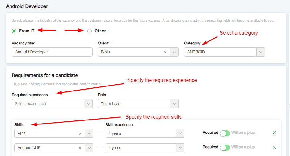 - мы поделили вакансии на IT и не IT. Для IT-вакансий нужно выбрать категорию и заполнить требования, которые будут отдельным блоком на публичной странице вакансии и по ним будет работать автоподбор кандидатов. Для не ИТ-вакансий также можно заполнять требования.