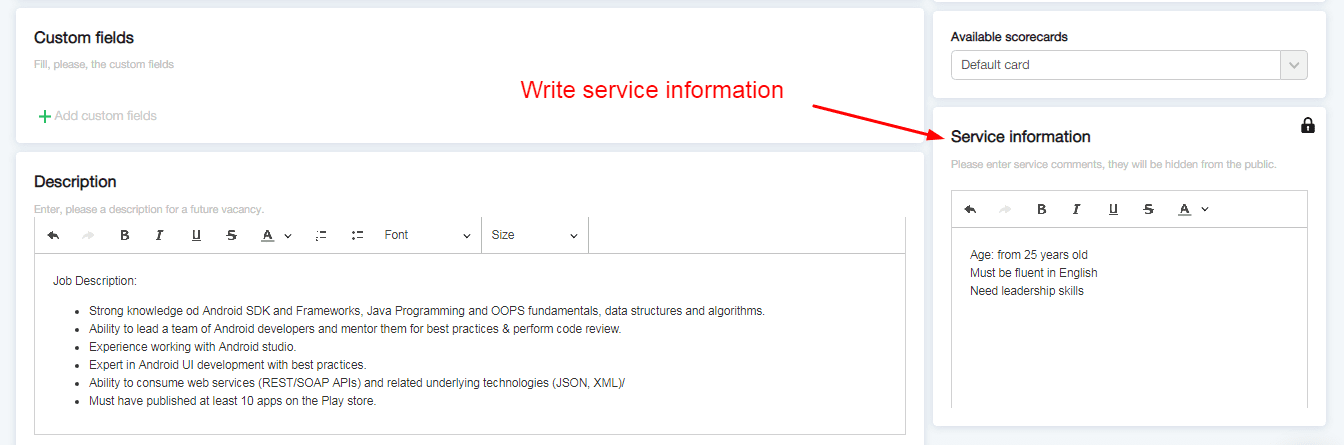 - добавили новый блок «Служебная информация». В этом блоке вы можете оставлять заметки, которым не место в открытом описании и не удобно сохранять в комментариях. Служебная информация не видна кандидатам и Hiring Manager-ам.