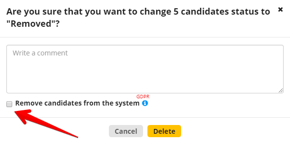 Система предложит перевести всех выбранных кандидатов в статус «Удален». Оставьте комментарий для себя и своих коллег.