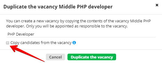 Щоб скопіювати кандидатів з однієї вакансії в іншу, клікніть на чекбокс в вікні. Всі кандидати будуть перенесені на етап «Знайдені».