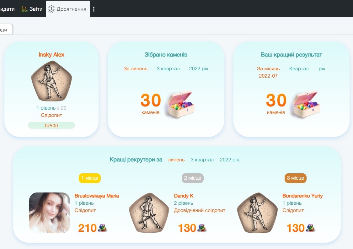 Перше, на що варто звернути увагу – це нова вкладка в меню, яка називається «Досягнення». За кожне досягнення рекрутер отримує валюту – дорогоцінні камінці, накопичує досвід, переходить з рівня на рівень, отримує купу емоцій – все це цікаво виглядає та заохочує!