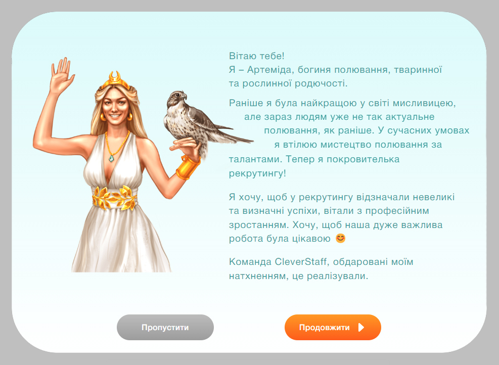 Хто любить конкуренцію, має нагоду позмагатися з колегами за призові місця. А піднакопичивши досвід, без перебільшень можна відчути себе… богинею або богом полювання ☺. Адже відтепер рекрутер тримає безпосередній контакт з античною богинею Артемідою, сучасною покровителькою рекрутингу ☺