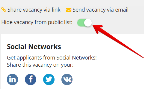 У розділі «Наші вакансії для кандидатів» видно всі ваші вакансії. Часто рекрутерам з тих чи інших причин необхідно приховати деякі з них з відкритого списку вакансій аккаунта. Наша команда реалізувала цю можливість! Для цього відкрийте вакансію і клікніть на кнопку «Приховати з публічного списку вакансій»: