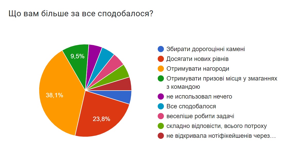 Далі ми спитали, чи легко було користувачам зрозуміти принцип роботи гейміфікації. Якщо ні, то що саме було не зрозуміло, і з якими складнощами (якщо вони були) зіткнулися. Від 17 респондентів ми отримали лаконічне – «досить легко». Інші – ще «в процесі» або на якомусь етапі бракувало більш детальної інформації в описі завдань. Перевіримо і це.