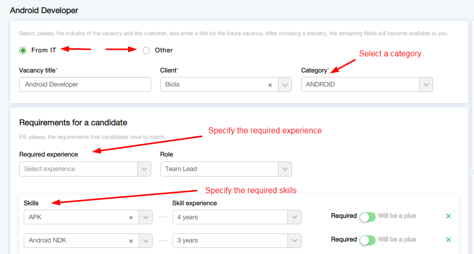- ми поділили вакансії на IT і не IT. Для IT-вакансій потрібно вибрати категорію і заповнити вимоги, які будуть окремим блоком на публічній сторінці вакансії і по ним буде працювати автоподбор кандидатів. Для НЕ ІТ-вакансій також можна заповнювати вимоги.