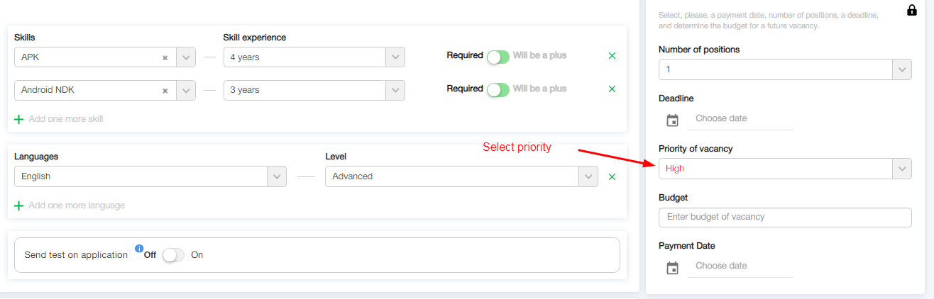 - додали «пріоритет» в вакансії. Його можна поставити під час створення вакансії або потім при редагуванні. А на загальному списку вакансій тепер можна сортувати за пріоритетом.